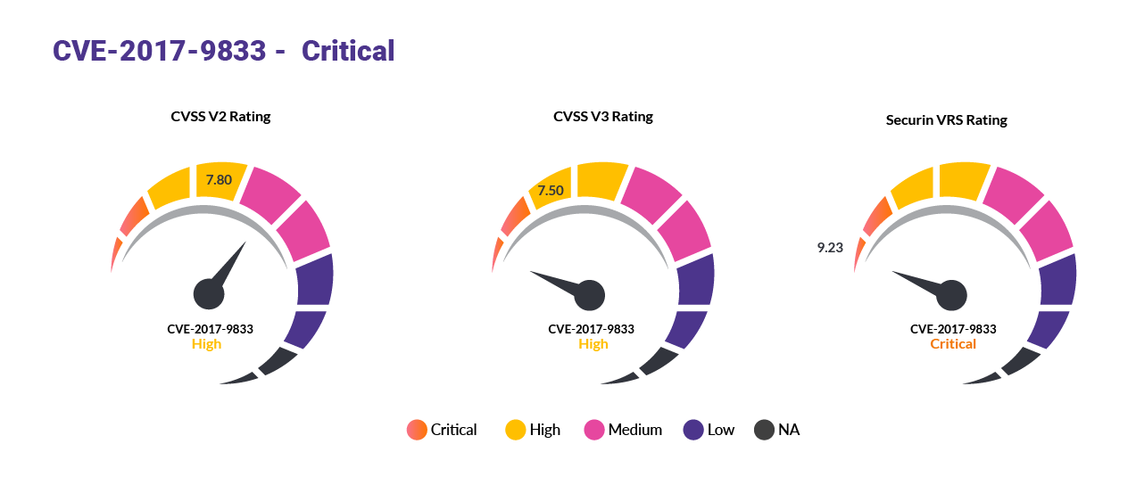 CVE-2017-9833 had an initial CVSS v2 score of 7.80 but was demoted to a CVSS v3 score of 7.50. However, since the vulnerability has been exploited actively by Hive ransomware and RedEcho APT, many years after it was discovered, our Securin VI platform has assigned it a VRS score of 9.23.