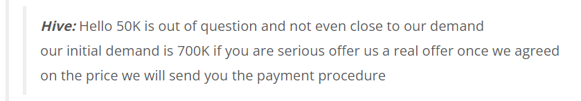 The communications employed by HIVE are shorter and direct, but are quick to lower ransom demands, offering substantial reductions several times through their negotiations.