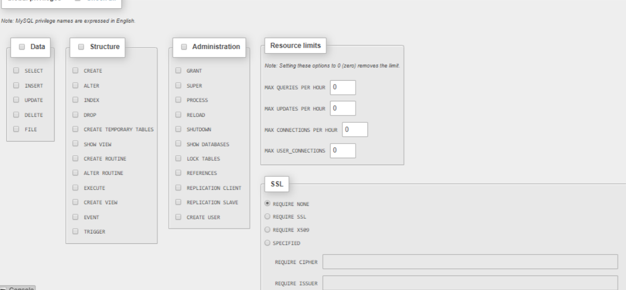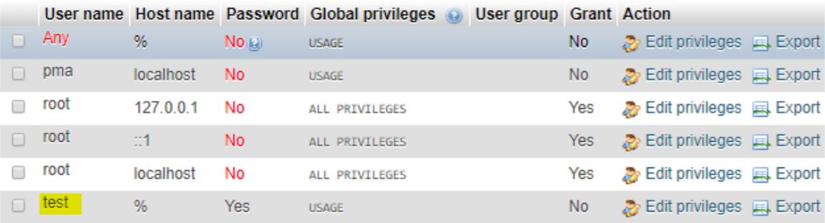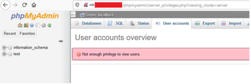 Figure 06: โTestโ users don’t have enough privilege to view users and other databases.